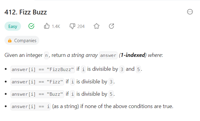 의역: n = 3 이라면 1은 3과 5의 배수 어느 것 에도 해당 되지 않으므로 "1", 2 또한 3과 5의 배수 어느 것 에도 해당 되지 않으므로 "2", 마지막 3은 3의 배수 임으로 "Fizz" 따라서 결과는