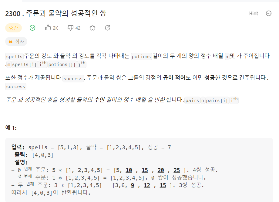 - 1 <= spells[i], potions[i] <= 105