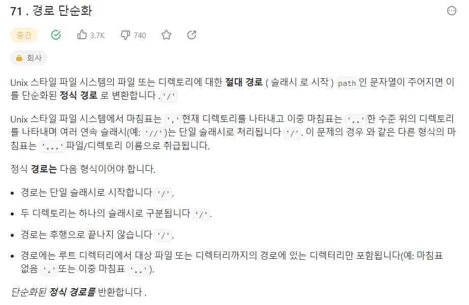 문자열 path를 "/"를 기준으로 나누어야 하므로 String.split(), StringTokenizer, String.toChararray() 중 한 가지를 사용해아 한다. 그리고 /..이 있을 경우 전에 있던 경로에서 한칸 앞으로 가야 하는 문제가 있는데 Stack을 활용한다면 쉽게 해결 할 수 있다. 즉 Stack과 Tokenizer를 활용하여 문제에 답에 필요한 문자열 그룹을 확보하고