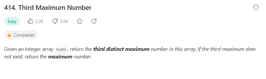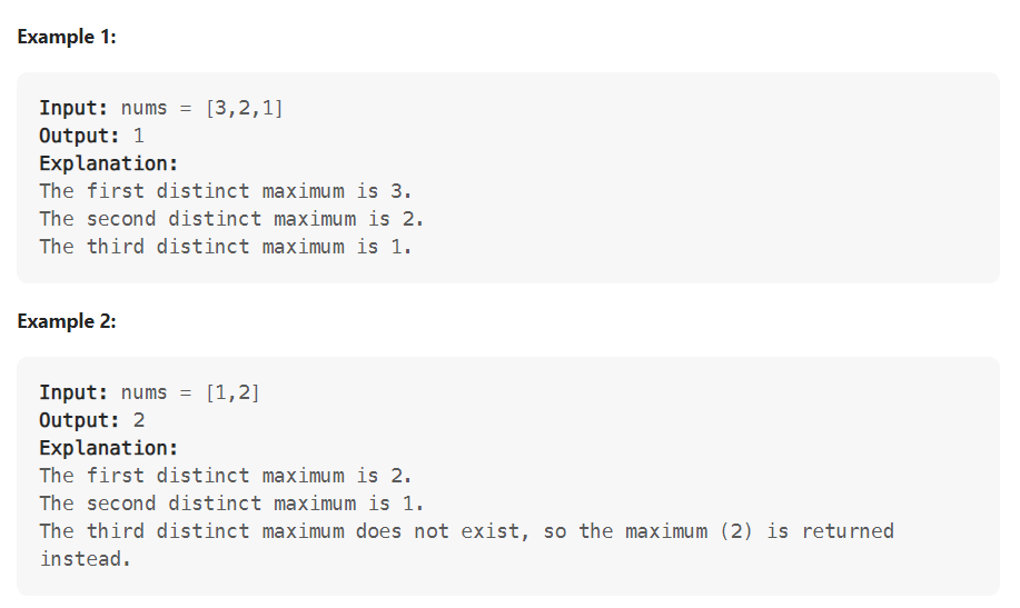 third distinct maximum number: 중복을 허용 할 때의 3번째로 큰 수 ex ( 3,2,2,1 -> 세 번째로 큰 수는 1)
