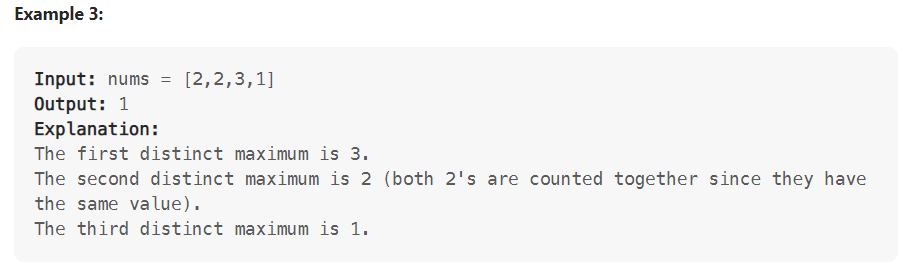 세 번째 예시에서 3번째로 큰 수는 1임으로 1 반환 (2가 2개 존재하지만 같은 숫자이므로 넘어간다.)