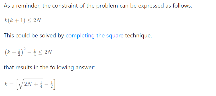 즉 k*(k+1)/2 <= n 의 관계식을 통해 k = f(n) 의 식으로 유도하여 푸는 것