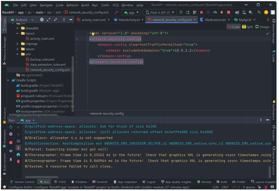 따라서 개발자는 서버와 안드로이드 앱 간의 통신에 HTTPS를 사용해야 하는데 지금 개발 과정에서는 HTTPS를 설정하지 않은 로컬 서버를 사용하기 때문에 별도의 설정 파일로 HTTP 트래픽을 허용하도록 해야 한다.