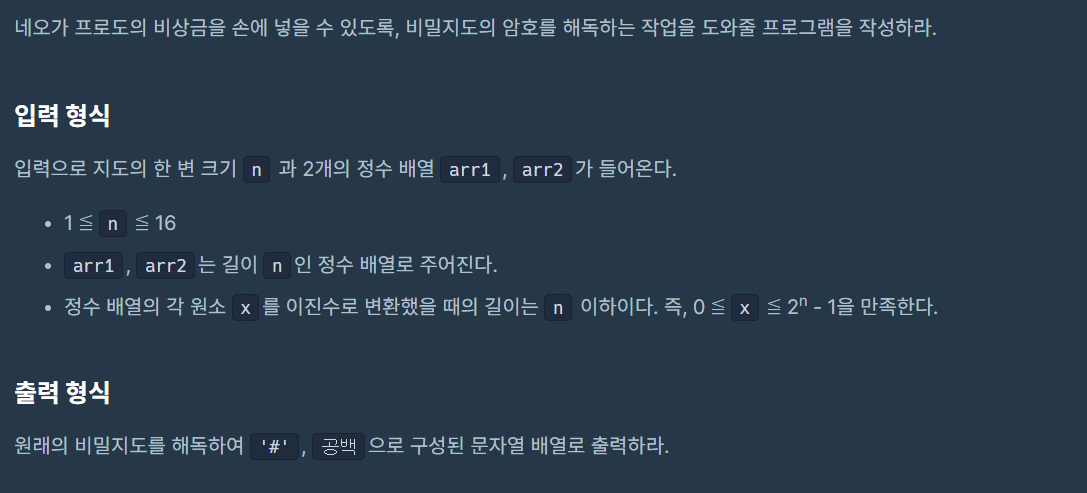 비밀지도의 정보가 이진 정보로 저장되어 있기 때문에 bit 연산자를 활용하거나 자바의 Integer.bitCount 혹은 Intger.highestOneBit() 같은 메소드를 활용해야 한다는 생각을 하고