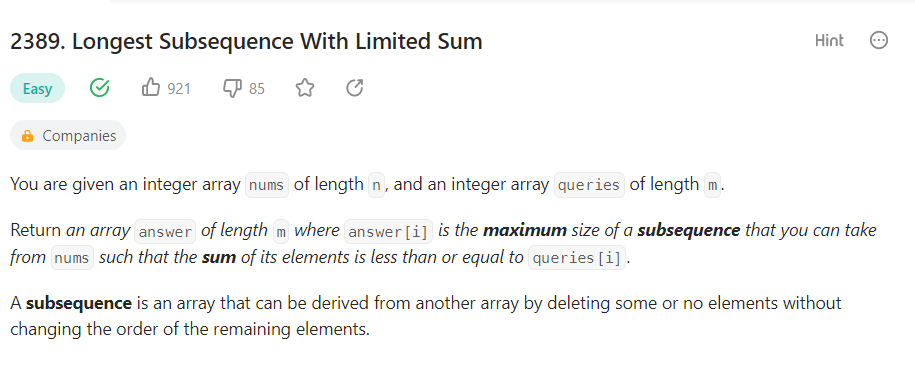 즉 쉽게 설명하면 answer[i]는 배열 nums의 요소들을 최대한 선택해 더해서 queries[i] 값 이하로 만들때 배열 nums에서 선택된 요소들의 개수다.