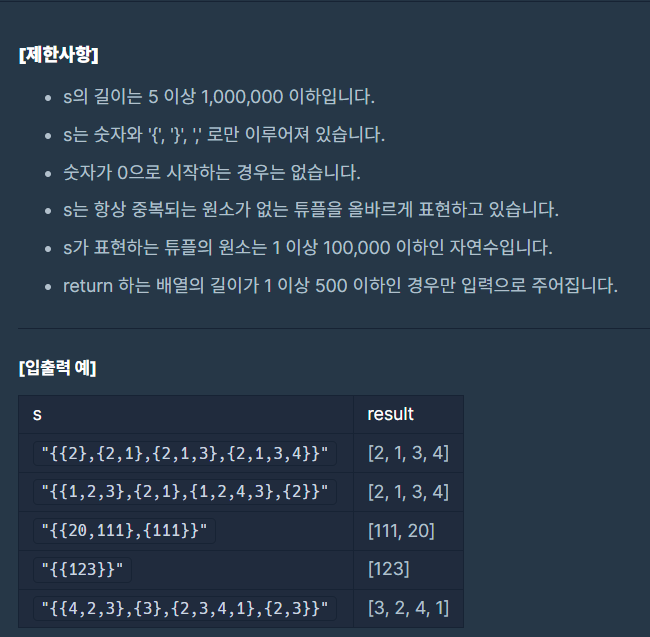 나는 일일이 "{", "}"을 찾고 문자열을 분리시키는 생각을 하였는데 우수 풀이에서는 애초에 분리 시킬 때 방해가 되는 요소를 모두 삭제 후 분리 작업을 시행하였는데 내가 사용한 방법보다 좋은 방법인 것 같다.