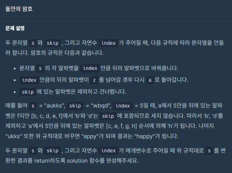 만약 s의 문자가 skip에 해당되는 문자임은 단순 반복문을 사용해 빼면 된다고 생각하여 문제 풀이에 들어갔다.