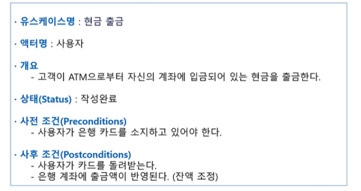 - 유스케이스 기술서: 유스케이스들의 구체적인 내용을 기술하는 명세서