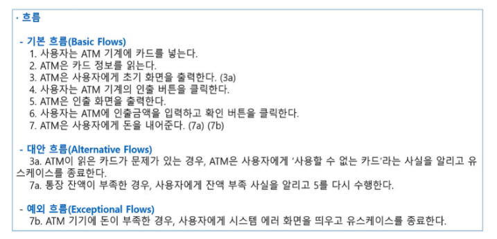 - 기본 흐름: 개조식으로 유스케이스의 과정의 입력 대비 출력의 변화를 기술