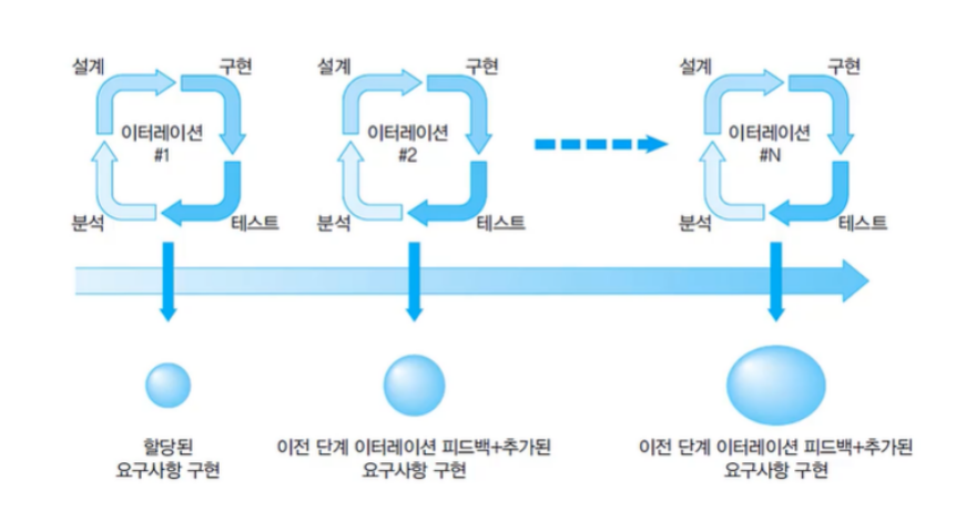 - 한번에 조립하는 방식에서 큰 규모의 작업을 짧은 주기를 갖는 이터레이션으로 분할 하고 점진적으로 규모를 키우면서 완성하는 방법