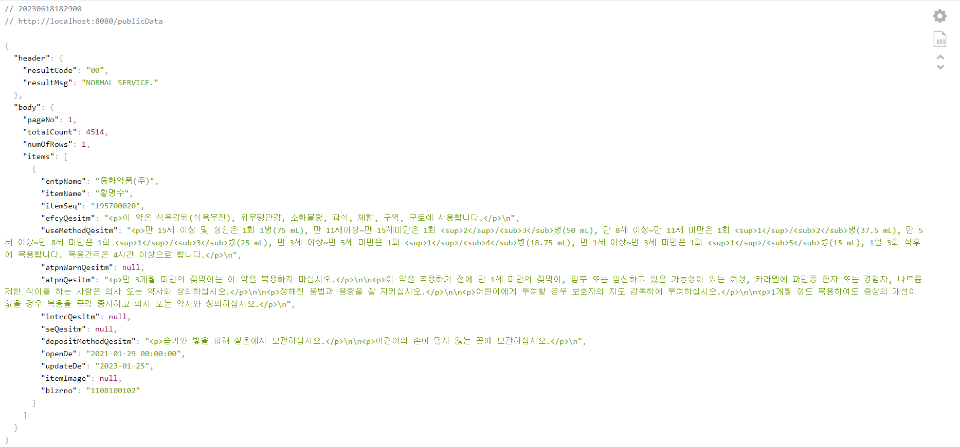 해당 코드에서는 Jackson 객체를 사용하여 응답 body 부분의 item 항목의 데이터를 파싱 하는 것 까지 추가해보았다.