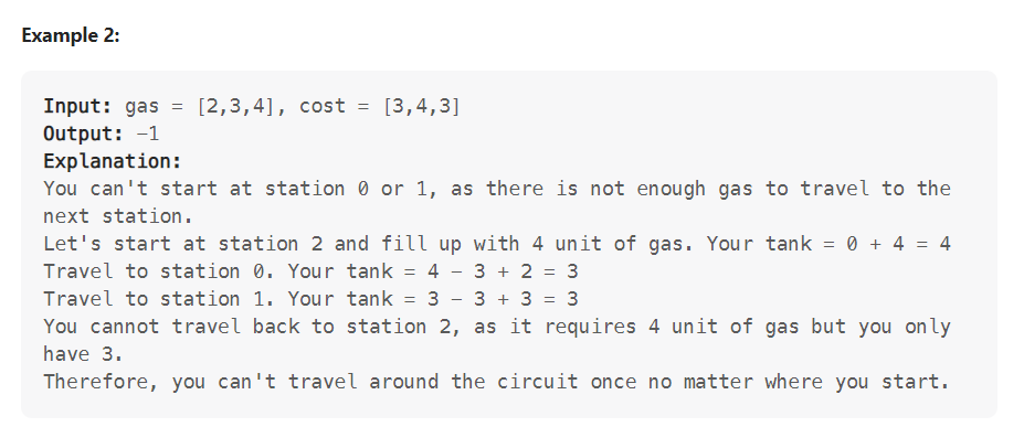 의역: n개의 가스 주유소가 원형으로 존재할 때 gas[i] 배열은 각각의 가스 주유소에서 주유할 수 있는 가스량을 나타내고 cost[i] 배열은 i번째 정류장에서 i+1의 가스 정류장으로 이동할 때 드는 가스의 양을 나타낸다. (만약 i+1이 인덱스 범위를 넘어 간다면 원형으로 이동 한다고 생각하고 0번 인덱스로 넘어간다)