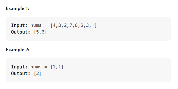 1번 예시의 경우는 배열의 길이가 8임으로 1~8까지의 숫자 중 없는 수를 체크 했을 때 5와 6임으로 Output은 [5,6]