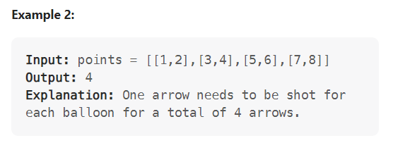의역: 4개의 풍선이 겹치는 범위는 [1,2], [2,3] -> 2 [3,4], [4,5] -> 4 임으로 2와 4의 위치에 한 발씩 쏜다면 모든 풍선이 터지기 때문에 모든 풍선이 터지는데 필요한 화살의 수는 2개