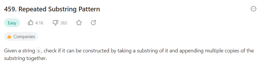 의역: 문자열 s가 주어질 때 해당 문자열의 일부분(substring)의 반복으로 이루어질 수 있으면 true 아니면 false를 반환해라. (혹은 해당 문자열이 반복되는 패턴으로 구성되어 있으면 true 아니면 false로 해석해도 좋을 것 같다.)