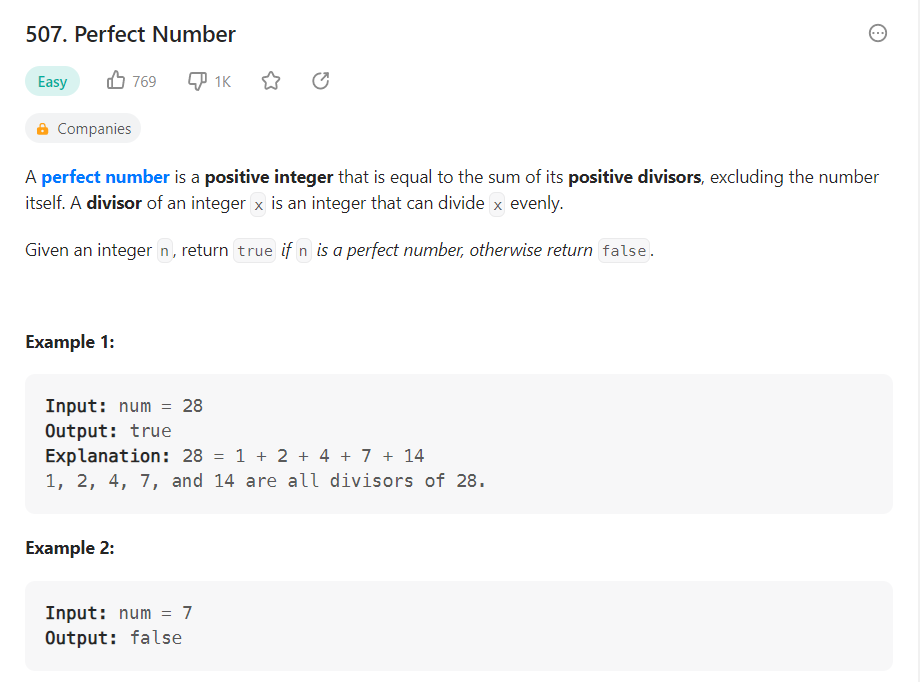 의역: 정수 num이 Perfect Number 이면 true 아니면 false 를 반환하라