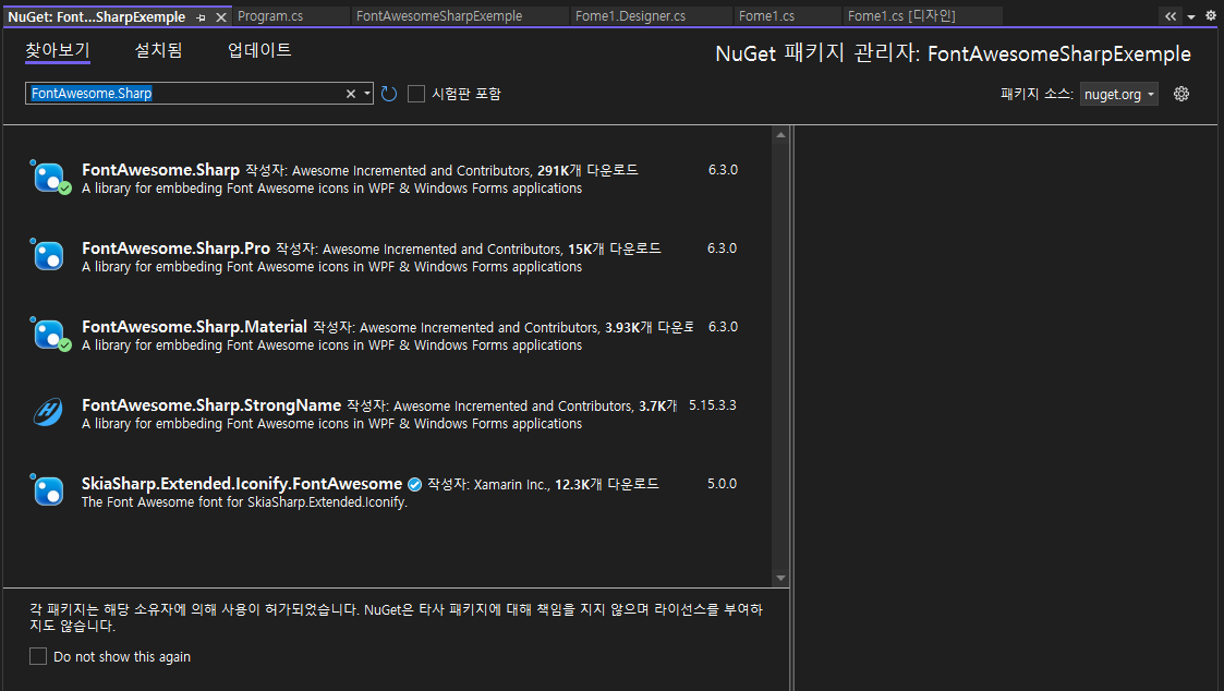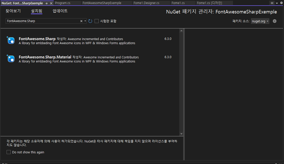 만약 실행 시 Program.cs 파일에서 new FontAwesome.Sharp가 인식이 안되어 사용이 불가능하다면