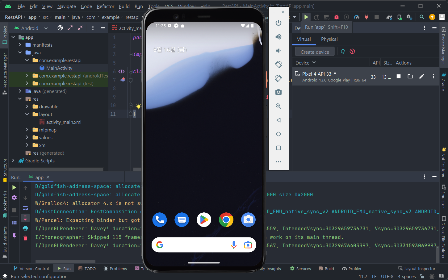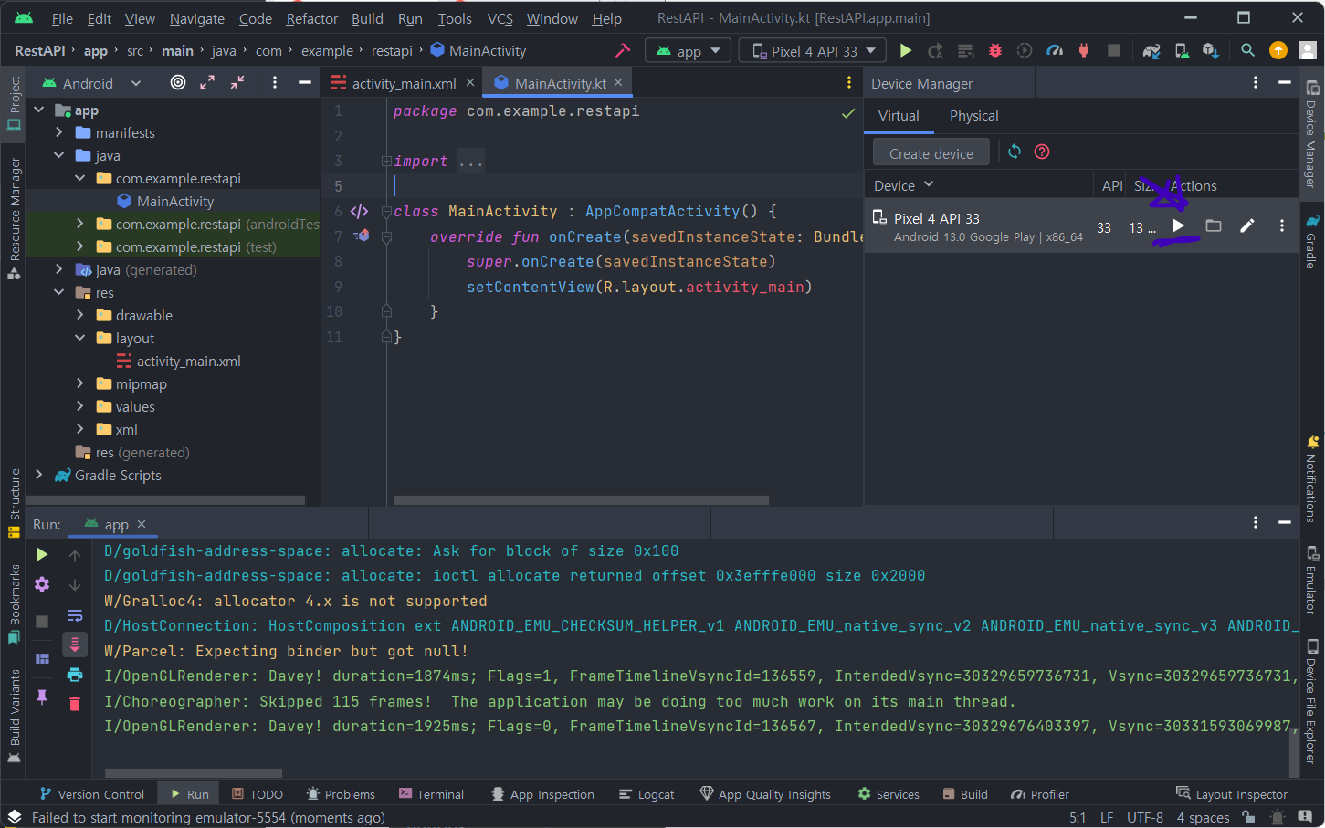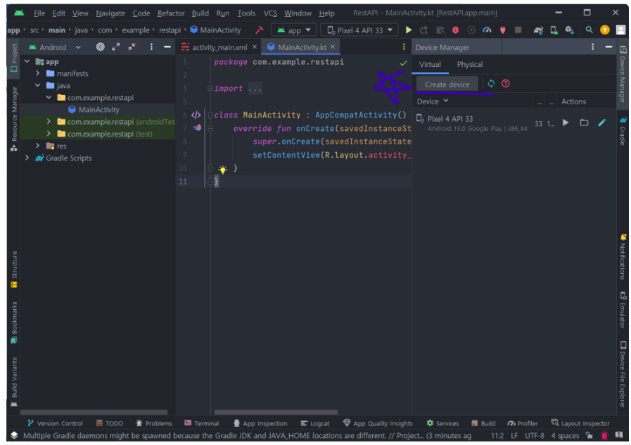 저는 미리 Create device 버튼을 통해 생성한 상태라 Pixel 4 API 33이 이미 존재하는 상태입니다.